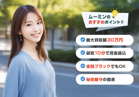 【MOOMIN|ムーミン】先払い買取サービスの買取対象商品や買取価格などのサービス内容と、申込みから買取商品の代金振込や商品発送までの流れなどの利用方法と審査に提出する必要書類など、注意点をわかりやすく解説します。