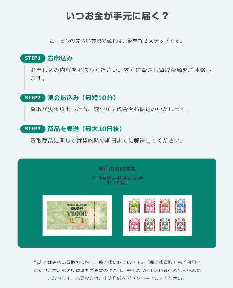 【MOOMIN|ムーミン】先払い買取サービスの買取商品は全国百貨店共通商品券・収入印紙です。