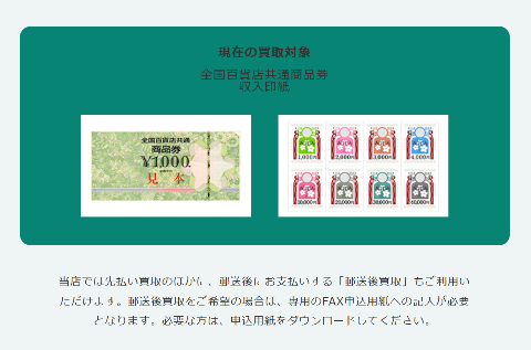 | 買取対象商品 | 全国百貨店共通商品券 収入印紙 |