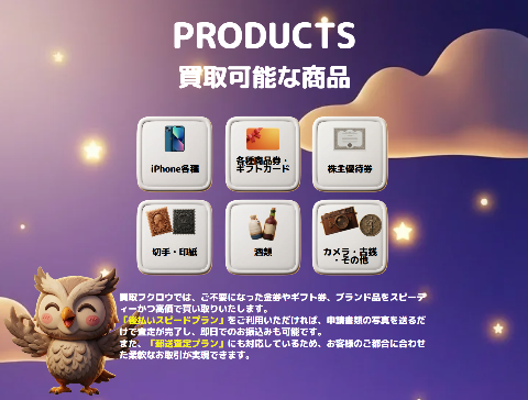 【買取フクロウ】はiPhone各種・商品券・ギフト券・収入印紙の買取サービスです。